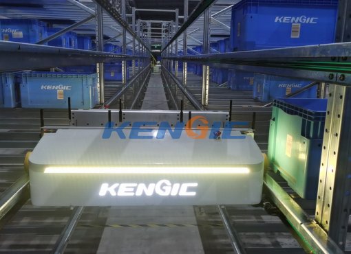 箱式兩向穿梭車作為多穿系統(tǒng)的核心設(shè)備,其主要功能是將料箱從一個點位搬運到另一個點位。根據(jù)機型不同,車輛可做直線定距、直線變距行走取放貨。其產(chǎn)品結(jié)構(gòu)主要行走輪系、貨叉組件、控制組件等組成。