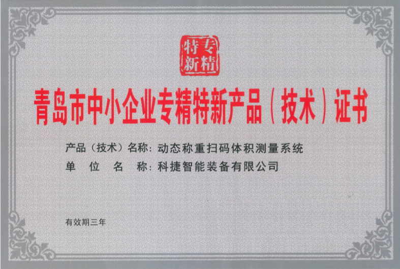 動(dòng)態(tài)稱重掃碼體積測量系統(tǒng)專精特新產(chǎn)品證書